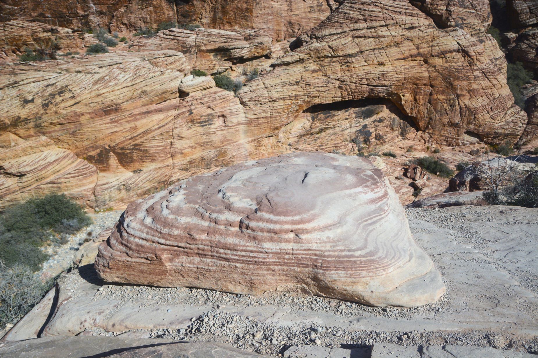 Here you can see the layers of sedimentary rock. The different colors are from various amounts of or lack of iron oxide in the composition of the rocks.
